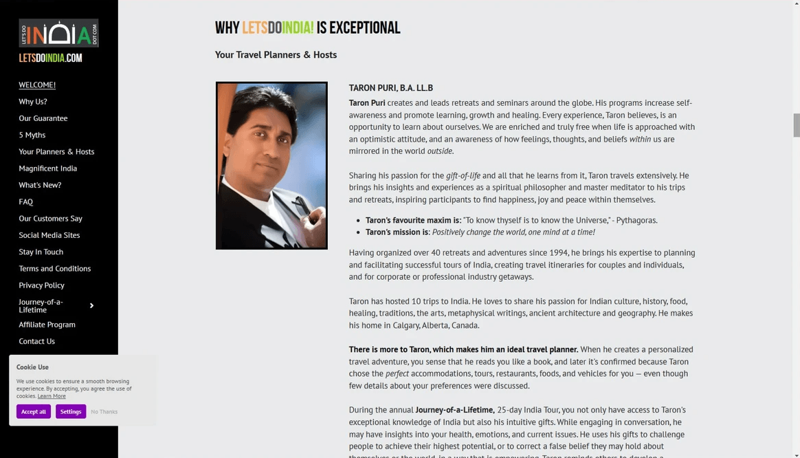- Traveling with Taron offers guests a rare perspective on India, enriched by his intuitive abilities and his expansive knowledge of the country’s spiritual heritage. Each adventure becomes a path of discovery, both within and beyond.